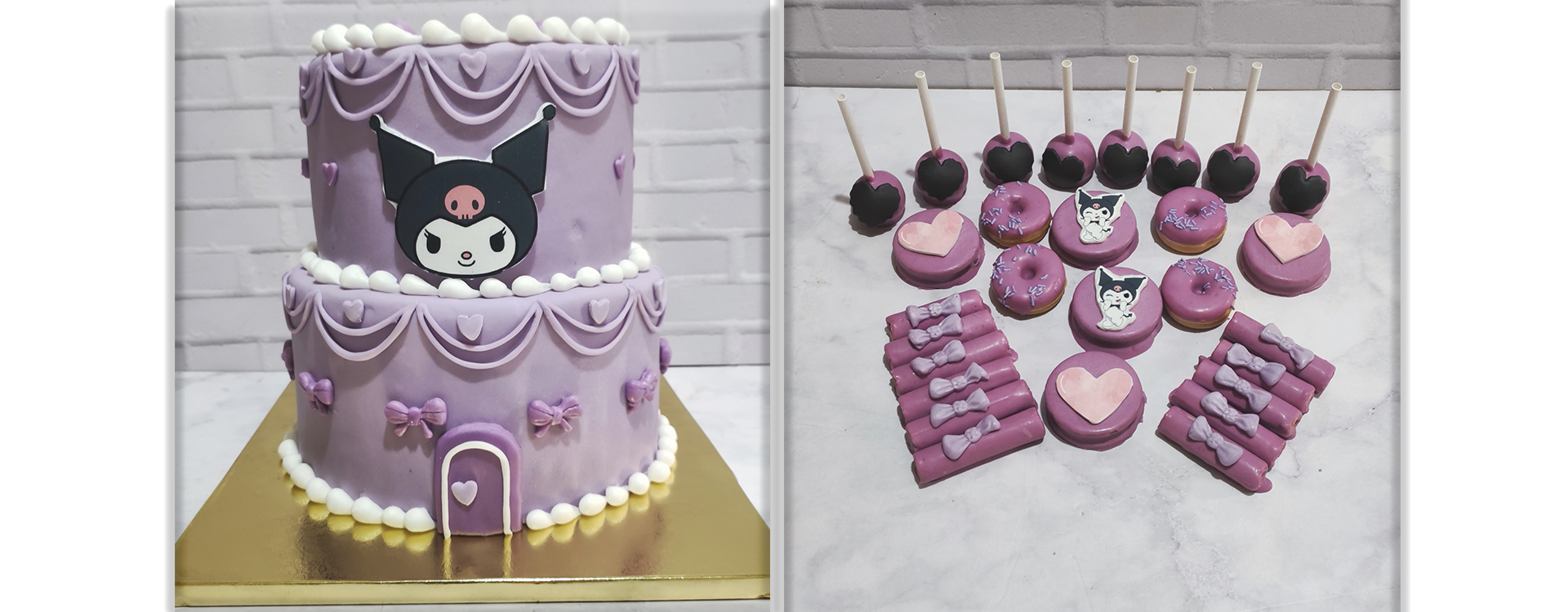 Todo esto se presenta en una mesa dulce decorada con motivos de Kuromi, creando una experiencia visualmente atractiva y temática para el cumpleaños. Cada componente ha sido cuidadosamente elaborado con amor y atención al detalle, para ofrecer una experiencia única y deliciosa.
