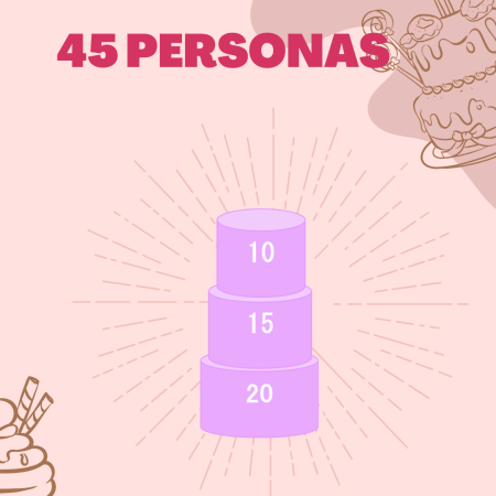 Esta torta de tres pisos puede adaptarse a tus necesidades de tamaño y cantidad de porciones. Se puede crear para un rango de 45 a 135 personas. Esto te permite asegurarte de tener suficiente para todos tus invitados.