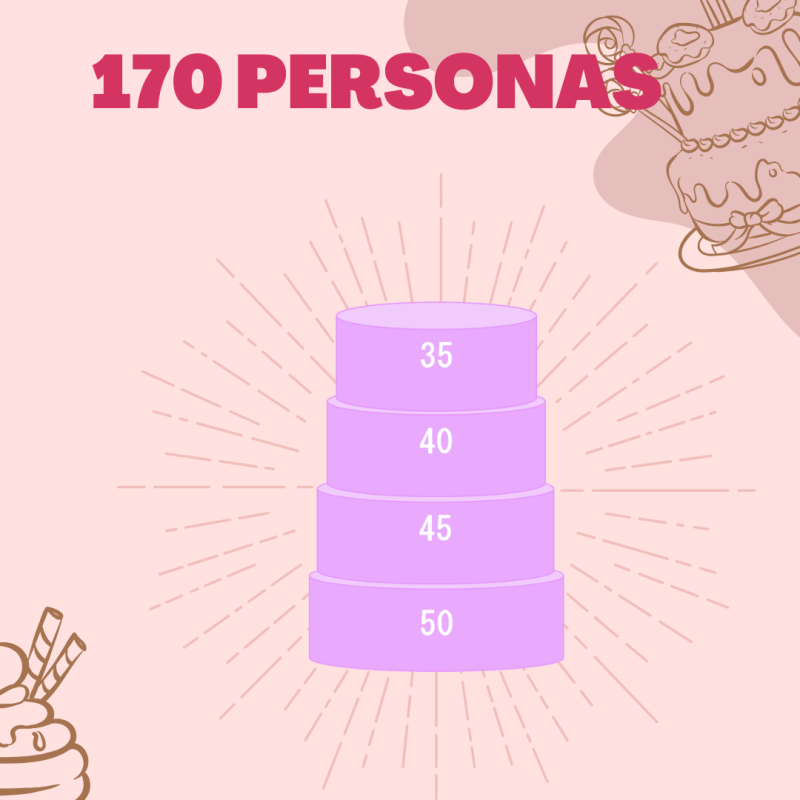 La torta novio bizcocho tiene una capacidad de entre 70 y 170 porciones, dependiendo del tamaño que prefieras. Es una torta ideal para compartir con tus seres queridos y disfrutar de un momento inolvidable. Además, es una torta muy fácil de cortar y servir, ya que cada piso está separado por una base.